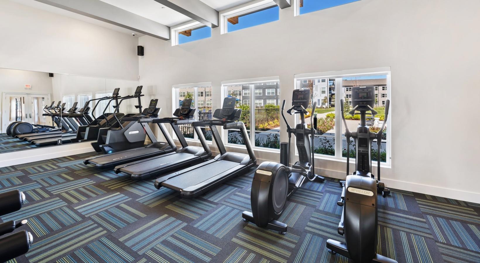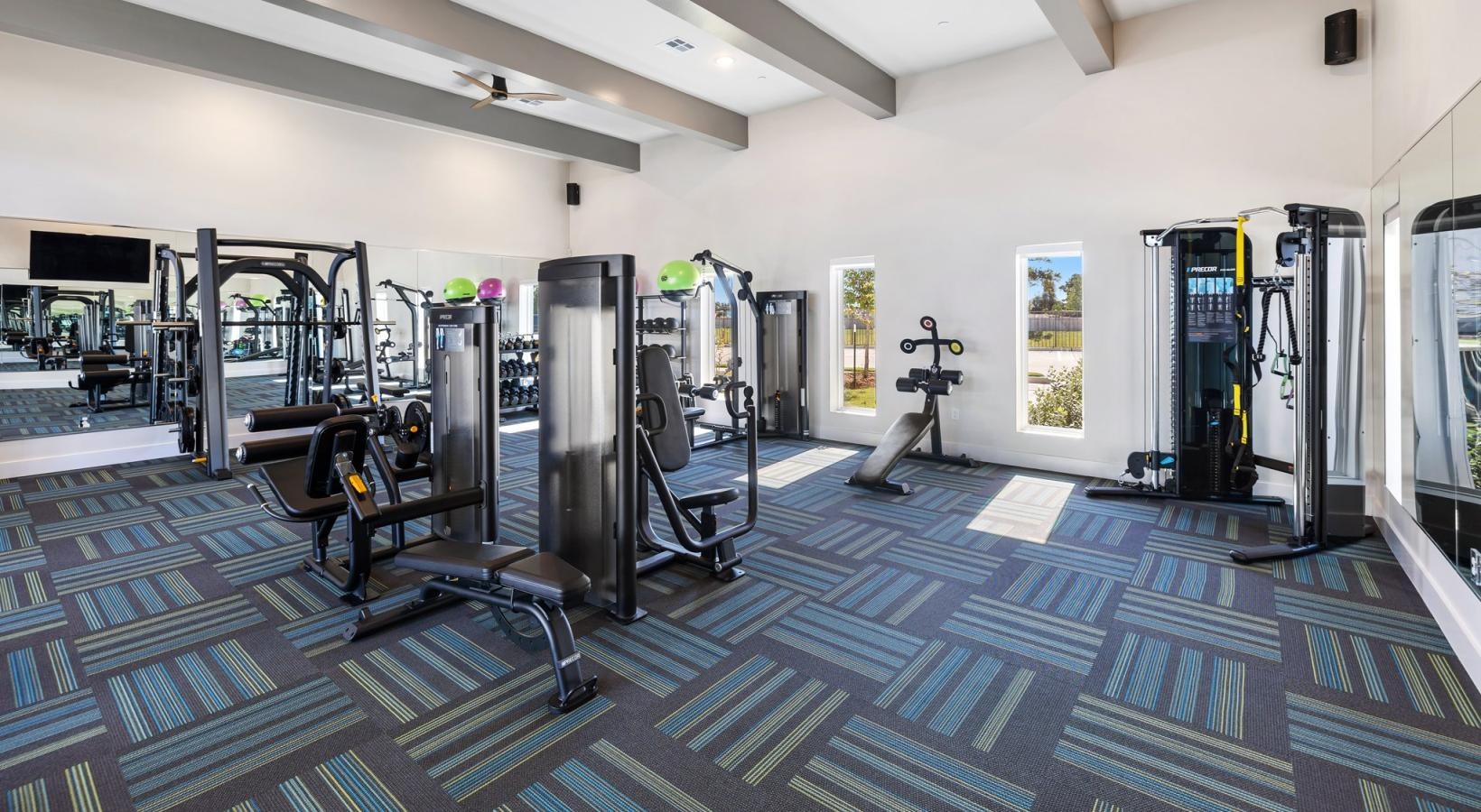 gym with exercise equipment and tv a bedroom with bed side table and lamp living room with seating table plant and windows a review of birchway spring cypress